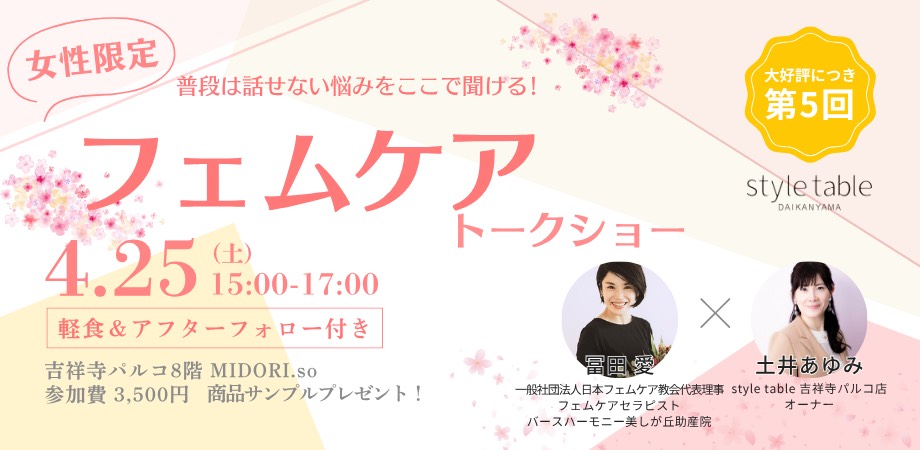 株式会社フラッグ(東京都港区 代表取締役:吹上直子)が展開するエシカルセレクトショップブランド「style table」(スタイルテーブル)の「style table 吉祥寺パルコ店」(運営:株式会社Peace(東京都渋谷区 代表:土井あゆみ)は、2026年4月25日(土)に、一般社団法人日本フェムケア協会 代表理事 冨田愛氏とコラボレーションし、トークショーを開催します。