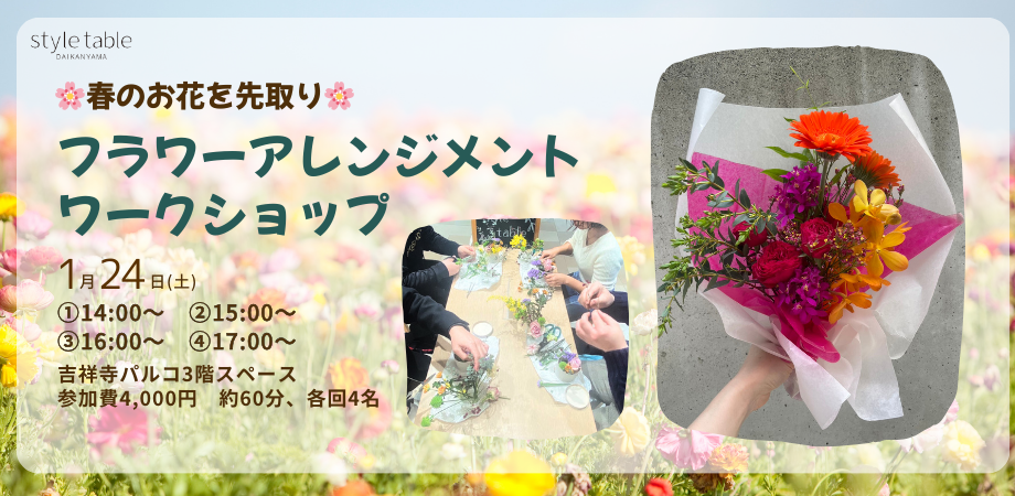 2026年1月24日(土)、株式会社Peaceが運営するstyle table吉祥寺パルコ店にて、エシカル・サスティナブルな暮らしを体験できるフラワーアレンジメントワークショップを開催します。