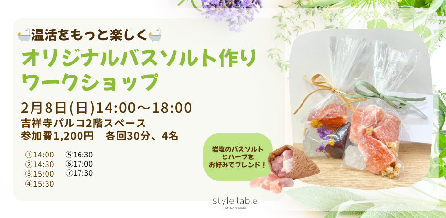 2026年2月8日(日)、株式会社Peaceが運営するstyle table吉祥寺パルコ店にて、天然素材を使った エシカルなオリジナルバスソルト作りのワークショップを開催します。エシカル・サスティナブルといった地球にやさしい選択を楽しく実践的に体験できるイベントです。